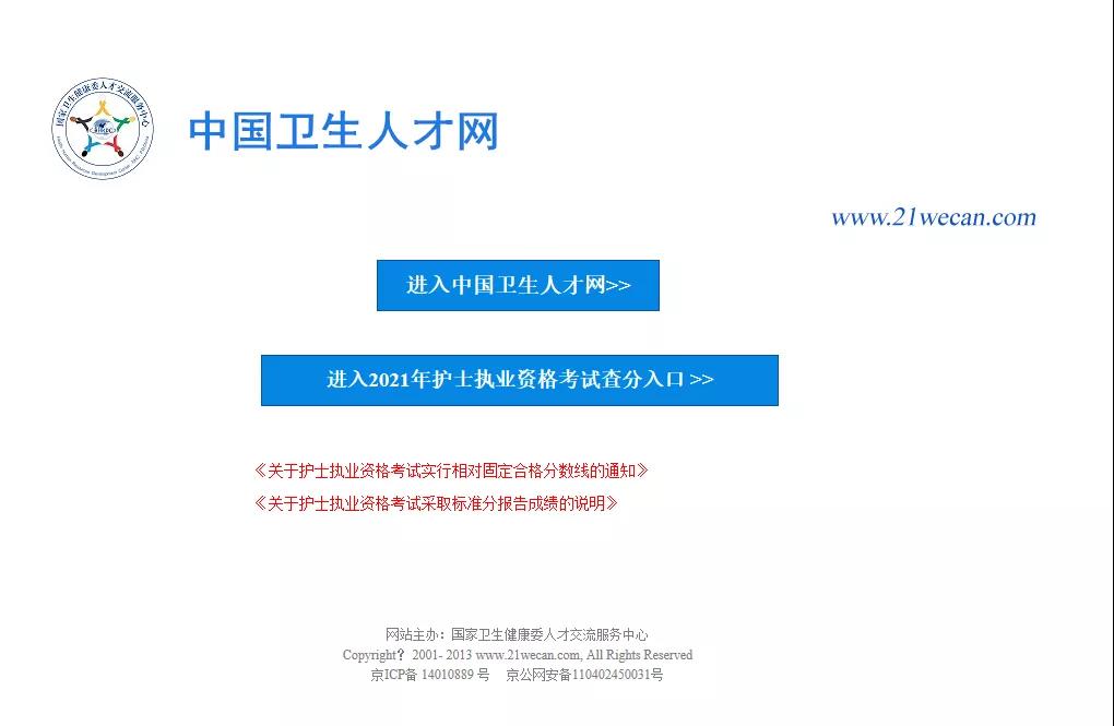 登錄“中國衛生人才網”網站,點擊“進入2021年護士執業資格考試查分入口”。