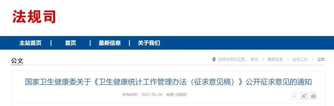 近日,國家衛健委印發《衛生健康統計工作管理辦法(征求意見稿)》(以下簡稱《征求意見稿》)公開征求意見的通知。