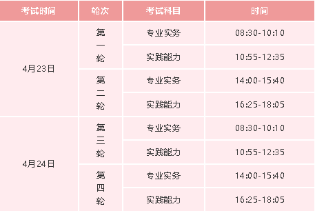 考試分為4輪次進行,每半天為一個輪次,考生將隨機分配至其中一個輪次參加專業實務和實踐能力兩個科目的考試,具體考試時間以準考證為準。