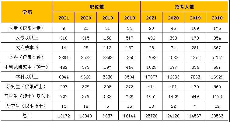 ▲歷年國家公務員學歷要求及對應職位數、招考人數