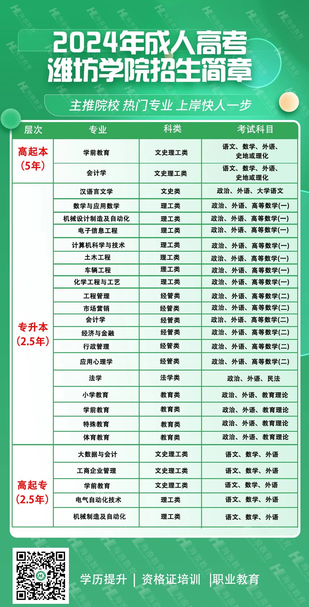 所學(xué)專業(yè)為2600/生/學(xué)年。(最終繳費(fèi)金額以院校平臺為準(zhǔn))高起專、專升本學(xué)制為2.5年,高起本學(xué)制為5年。