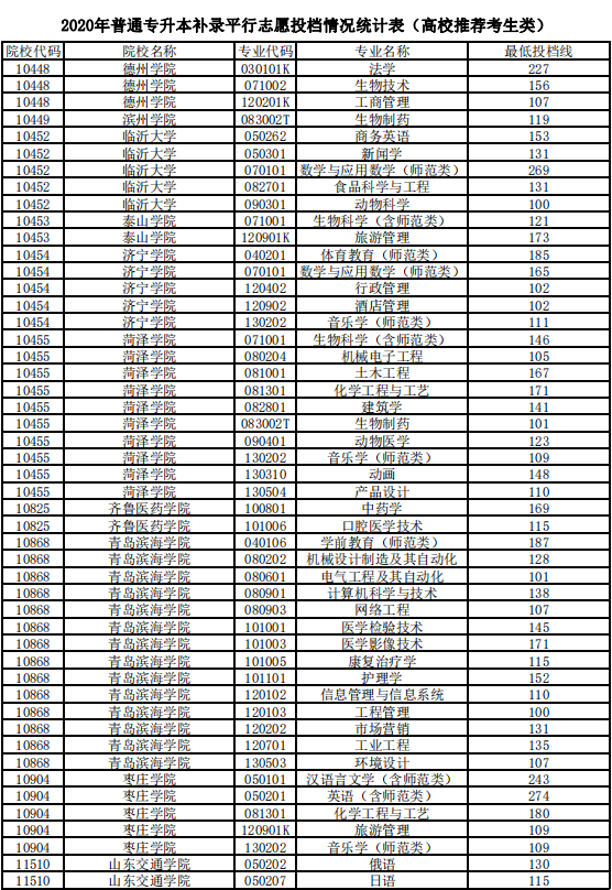 山東省2020年普通專升本補錄平行志愿投檔情況統計表