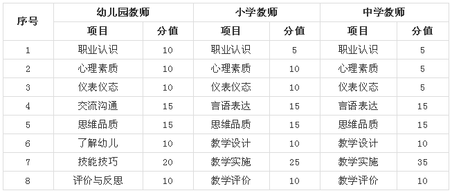 中小學教師資格考試面試滿分100分,各項目分值具體如下(中職教師面試分值同中學教師)