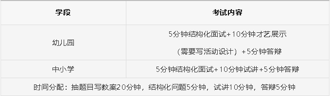 面試統一使用教育部考試中心研制的面試測評軟件系統。考生經過候考、抽題、備課、回答規定問題、試講(演示)、答辯等環節完成面試。原則上備課時間20分鐘,面試時間20分鐘。